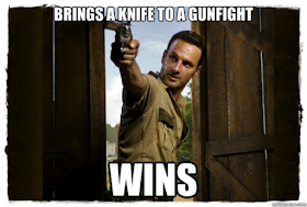 Season 3 of AMC's The Walking Dead seems to have amped up from last year, with the intrepid (and dwindling) group of survivors now whittling down dozens of zombies per episode. I guess the long spell of sitting on Hershal's farm eating carbs last season helped them rest up, but I've still noticed a rather proliferate use of scarce ammunition, which doesn't seem like the optimal way to deal with a zombie threat.